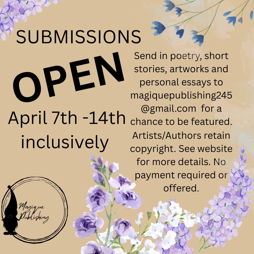 So please! Send in your artworks, your poetry, your literary thoughts, short stories, personal essays, samples, and news!